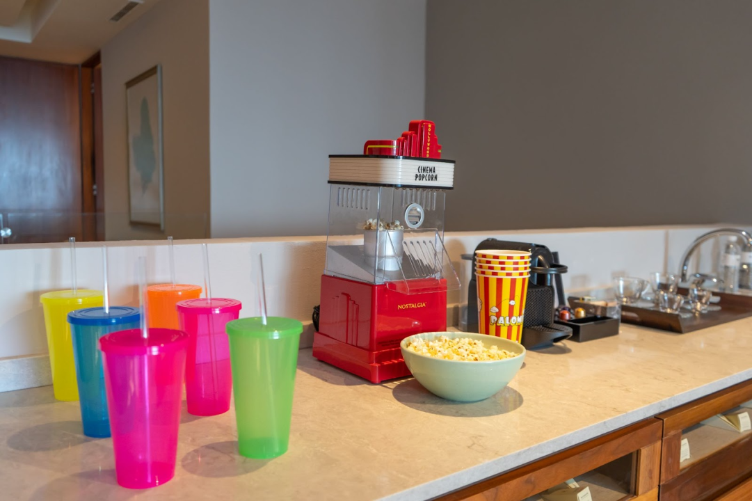 To enhance the family experience, the suite includes endless amenities for kids. A mini teepee hideout, bubble machine, sand castle kit, popcorn machine for movie nights, star projector to create magical bedtime moments, and a variety of games such as UNO Splash, Lotería Deluxe, and a PS4 gaming system ensure hours of family-friendly entertainment. Additional touches include a mini beach bag, play mat for toddlers, and an aroma diffuser for added relaxation.