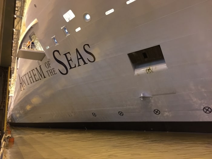Built in a dry dock facility, the initial stages of s cruise ship’s construction take place. Put simply, in the case of 168-ton Anthem of the Seas and other large ships, giant blocks of the ship are made and welded together to form the whole ship. Once that is done and before interior spaces are outfitted with what we see as passengers, that dry dock is flooded and the ship (hopefully) floats. Which brings up the question: How do cruise ships float?