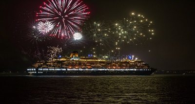 A volley of fireworks illuminated the sky overhead as Queen Victoria set sail on her world voyage, remodeling complete.