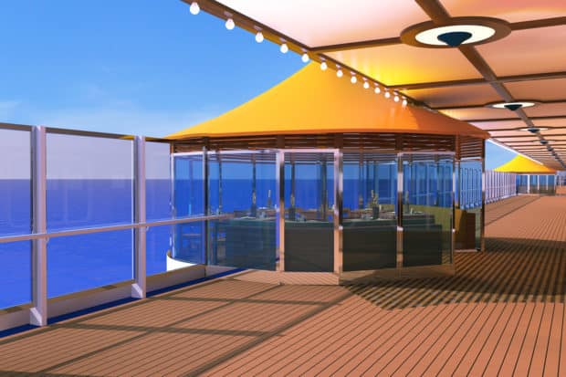 Measuring 16 feet across and up to 26 feet wide the promenade will feature six cabanas and two Jacuzzis that extend out from the side of the Costa flagship, creating the sensation of being suspended over the sea. In the cabanas guests can relax over drinks or enjoy a romantic sunset dinner, comfortably sheltered from the wind.