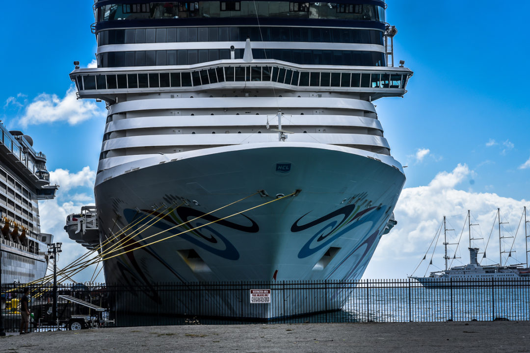 Similar to other cruise ships, not everyone gets off the ship at every port here. This image gives you an idea of the size of our ship, next to much larger Norwegian Epic.