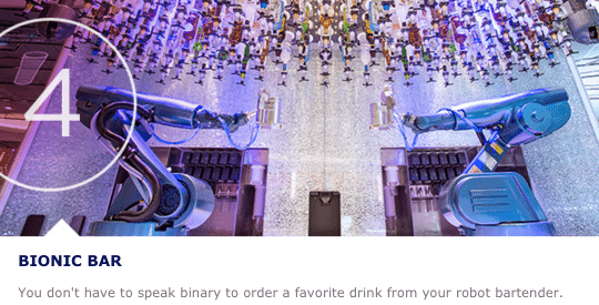 Harmony of the Seas is the first Oasis-class ship to feature the futuristic Bionic Bar, proven popular on Royal Caribbean’s Anthem of the Seas, where two robotic bartenders shake, muddle and mix a wide variety of drinks made just to order.