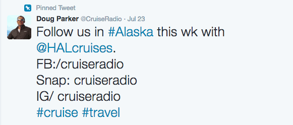 Following Along SociallyDoug Parker is the creator and host of CruiseRadio, an online source that delivers radio-style podcasts, along with interviews, news, industry insights, interactive listener Q&As, and more all about the world of cruise travel. In addition to the CruiseRadio website, Parker posts on a variety of social platforms as well, much like we do here. Posting on Twitter, @CruiseRadio sailed with Holland America Line to Alaska inviting listeners and online friends to follow along.   Over the course of the 7-night voyage, we did just that and came away with a good feel for that experience was like.  Taking a look back at how Doug went about sharing his experience brings a short list of best practices we look for when choosing who to follow.