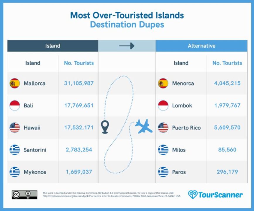 Overtourism is a growing problem as tourist destinations become overcrowded, negatively impacting locals and visitors. Welcome to “destination dupes,” less crowded alternatives to popular tourist destinations. The study identifies Puerto Rico, Menorca, Lombok, Milos, and Paros as good alternatives to Hawaii, Mallorca, Bali, Santorini, and Mykonos, respectively. These dupes offer similar experiences with fewer crowds, benefiting tourists and locals.