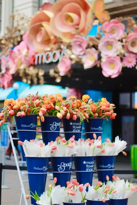 On Sunday, April 27, visitors to Macy’s Herald Square were invited to experience a spectacular floral celebration when the Macy’s Flower Show officially opened to the public at 11 a.m. As a special tribute to Holland America Line’s 152nd anniversary and Dutch heritage, brand ambassadors distributed 1,000 signature tulips from The Bouqs Co. to visitors outside the store’s main entrance. It was a vibrant public celebration bringing together Manhattan flower enthusiasts with Holland America Line’s rich maritime traditions.