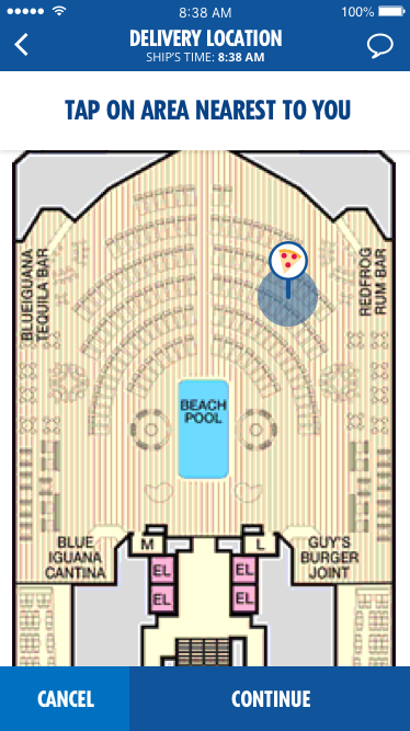 Using the “Pizza Anywhere” function, guests click on the ship’s deck plan to mark their location, take a selfie to identify themselves and select their pizza and toppings. $5 pizza is cooked to order, charged to their Sign & Sail account and delivered to their location.