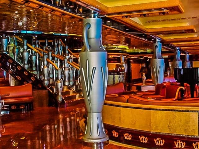Wait. What did I say? We should enjoy art on ships to ‘insure a totally comprehensive experience’? Yes, I sure did. You see, the art collection that adorns the hallways and public spaces of cruise ships is often the glue that makes the theme of the ship work. It’s a topic we have had our eye on since Carnival Legend debuted with a fabulous urn collection in 2002.