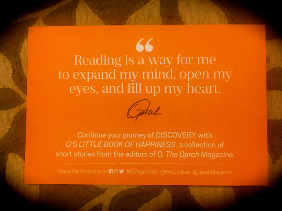 At the end of this day, we came back to our staterooms to find a keepsake book entitled O’s Little Book Of Happiness. The accompanying thought to take to sleep: