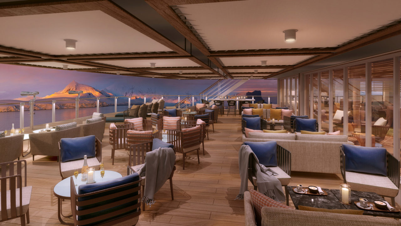 Seabourn‘s new ultra-luxury purpose-built expedition ship, Seabourn Venture, will feature a new Bow Lounge directly focusing passenger attention outward.