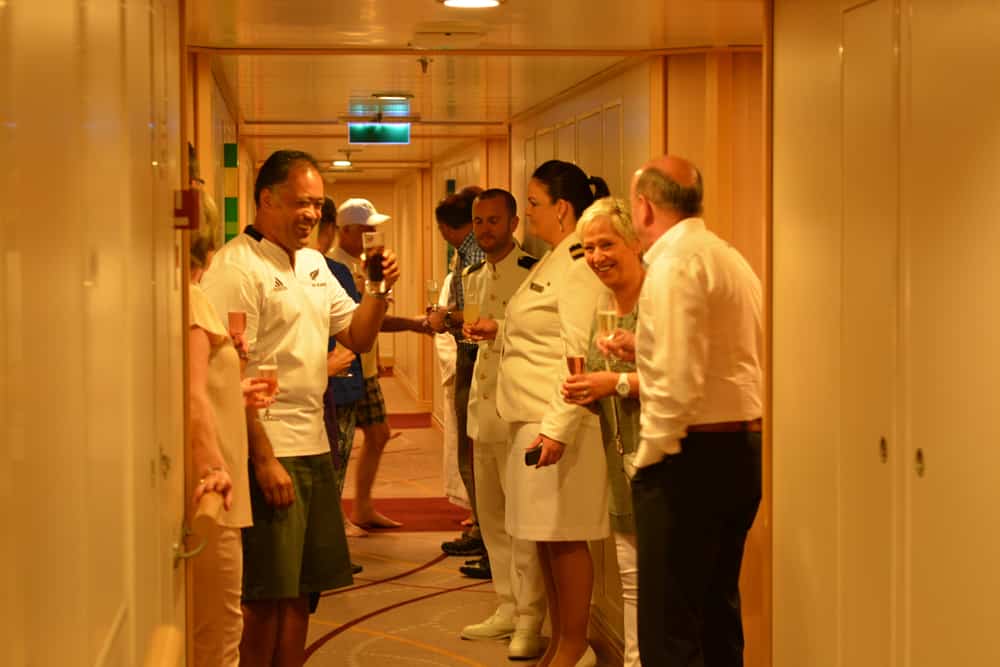 This signature event brings Seabourn Guests out of their suites and into the hallway to meet their neighbors. Seen here, my neighbor and former NFL football player Jesse Supolu who we sailed with not long ago for Cruising With A Cause on sister-line Princess Cruises.