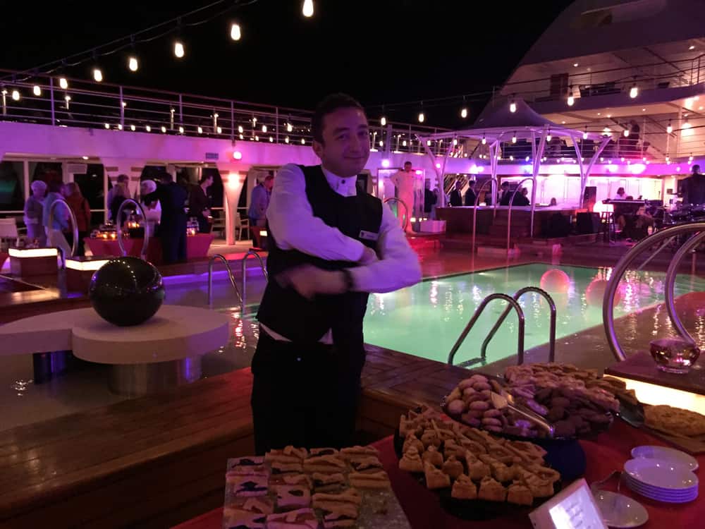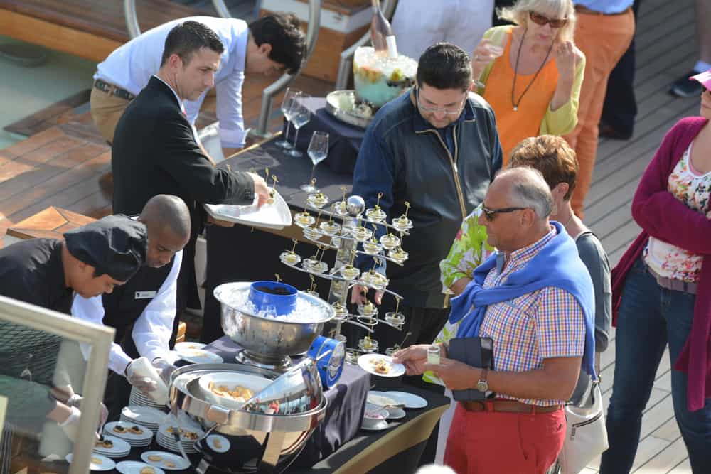 Epicurean evening begins with an Epicurean Officers On Deck sailaway, followed by a dinner of the same theme then Seabourn Guests come back on deck to visit a number of dessert creation stations where chefs make popular desserts right before their eyes.