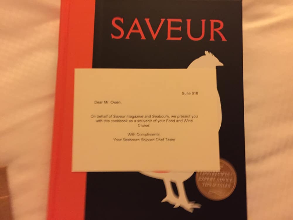 Little things left on our beds at turndown, like this wonderful 600+ page SAVEUR cookbook made for great take home memories of the Seabourn Food And Wine Cruise.