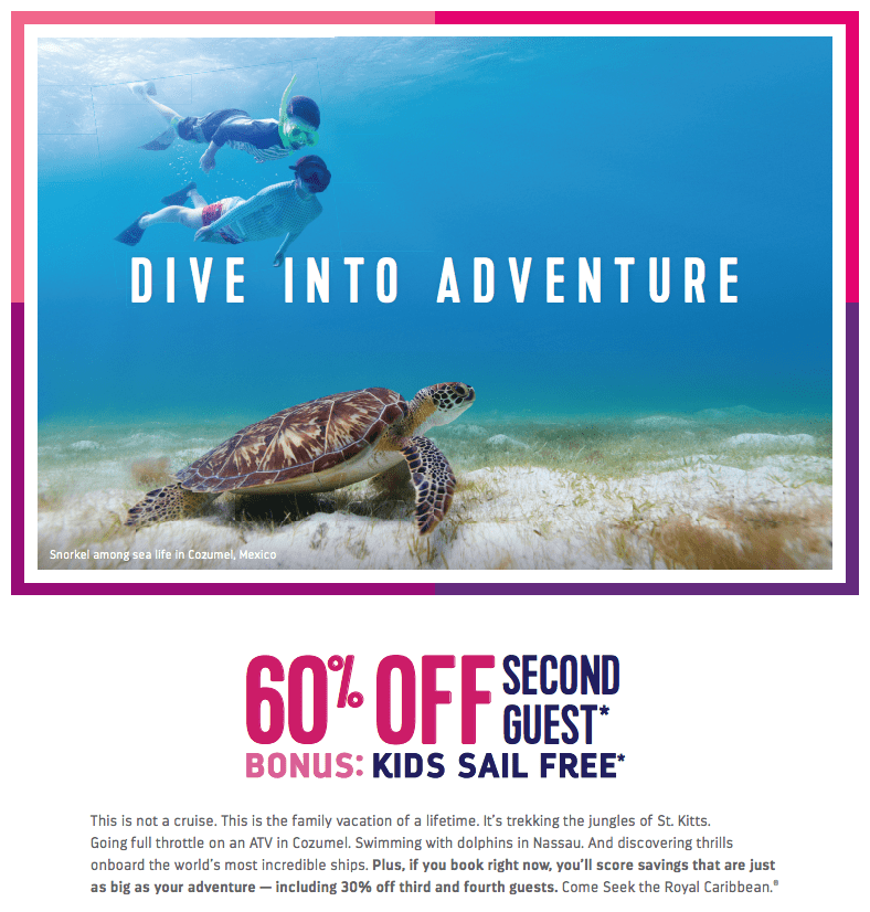 *Cruise must be booked June 1, 2017 through June 5, 2017 (“Offer Period”). Offer applies to sailings departing on or after July 1, 2017. Offer excludes China departures. Offer includes 60% off cruise fare of second guest who must be booked in the same stateroom as a first guest who books at full fare (“BOGO60”). Offer also includes 30% cruise fare savings for 3rd guests and higher booked in the same stateroom as the first two qualifying guests. Additionally, Kids Sail Free offer provides free cruise fare of third and higher guests who are 12 years or younger as of cruise departure date, booked in the same stateroom as the first two qualifying guests in a triple or quad occupancy stateroom on 5 nights or longer Bahamas and Caribbean sailings departing Sep. 1, 2017-May 31, 2018, excluding sailings departing 11/17/17-11/27/17, 12/17/17–1/8/18, 2/15/18-2/20/18 and 3/10/18-4/1/18. Offer also includes an instant savings determined by sailing length and category booked: $25 off per stateroom for interior and Oceanview on sailings 5 nights or less, $50 off per stateroom for balcony and suite on sailings 5 nights or less, $50 off per stateroom for interior and Oceanview on sailings 6 nights or longer and $150 per stateroom for balcony and suite on sailings 6 nights or longer. All other charges, including, but not limited to, taxes, fees and port expenses, are additional and apply to all guests. BOGO60 does not apply to third and higher occupancy guests.