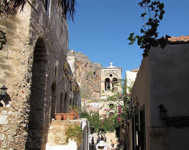 Monemvasia was once on the Peloponnese mainland. Then an earthquake turned it into an island. It is now joined to the mainland by a narrow causeway that limits access, originally for reasons of defense. The tall, flat isle is completely honeycombed with nooks and grottoes, narrow alleys and rock-carved rooms. Clearly it was a formidable redoubt in times of attack, and earned its nickname the Gibraltar of the East. The upper town, long uninhabited, has narrow pathways leading to the Byzantine Aghia Sophia church, and remains of the medieval fortress and walls. In the lower town, look for the bell tower that leads you to Elkomenos Square, with its namesake medieval Elkomenos Christos church and a small museum