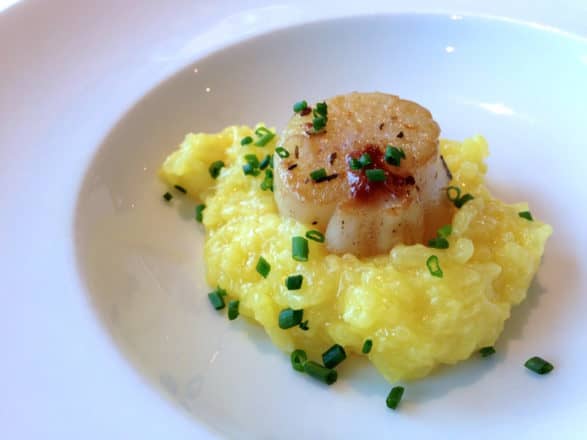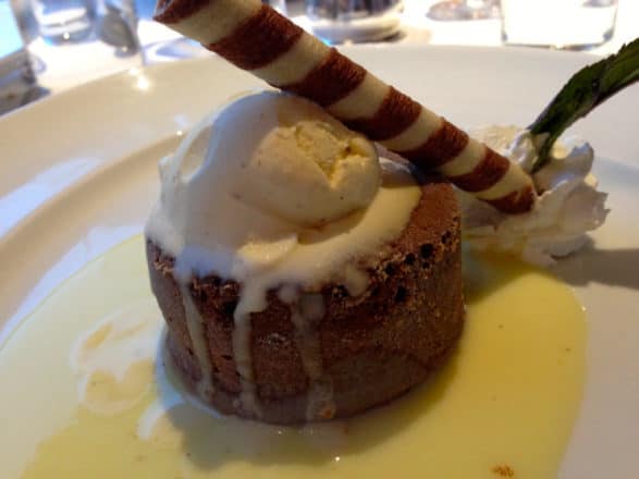Individual choices are prepared or finished as ordered and come out of the kitchen almost too hot to eat. A single dessert offering is nicely done and a cheese bar is available as an alternative. The entire process starts at 7:00 or 7:30, depending on the day’s port schedule and takes a couple hours.