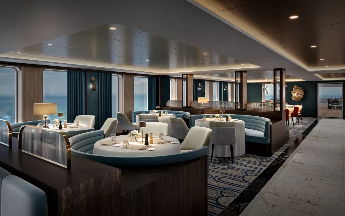 Yacht Club: The social heart of Star Seeker beckons guests from sunrise to starlight. By day, this beloved gathering spot serves handcrafted coffee creations alongside quick bites for breakfast or a casual lunch. As evening falls, the space transforms into an intimate lounge where travelers unwind with cocktails and conversation, all accompanied by subtle melodies.